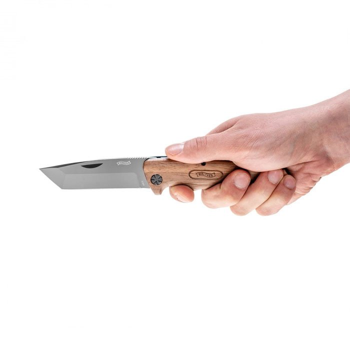 Walther BWK 4 Tanto bıçağı, dış mekan çakısıdır. Walther Blue Wood Knives serisi, iki ceviz saplı terazi arasında tutulan tanto uçlu bu bıçak, açık hava maceraları için mükemmel bir arkadaştır. Bıçak, gelişmiş korozyon direnci için gri titanyum kaplamalı 440C çelikten yapılmıştır. 94 mm’lik bıçağın omurgasında bir çivi ve başparmak dayanağı vardır. Linerlock, bıçağı güvenli bir şekilde açık tutar ve siyah bir evrensel pivot vida, bir bozuk para ile bile bıçak hareketini ayarlamanıza olanak tanır. Dokulu yüzey ve mükemmel şekilli parmak girintileri, Walther BWK 4’ün her türlü hava koşulunda elinizden kaymamasını sağlar.